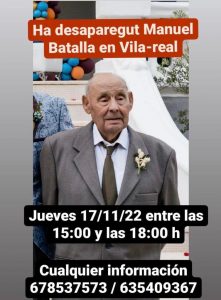 Ràdio Vila-real té la última hora de la desaparició del veí de 93 anys , Manuel Batalla Cortell, desaparegut ahir dijous dia 17 sobre les 15.00 de la vesprada. Hem parlat amb un familiar directe que ens ha confirmat que sobre les 18.00 hores van acudir al domicili de l’home, situat en el carrer Sagunt, en la zona sud de la ciutat, i van constatar que havia dinat a casa ja que quedaven les restes del menjar, que només faltàven les sabates d’anar per casa i que en eixir va tancar amb clau. No té cap malaltia mental ni física més enllà de l’estat de la seua pròpia edat. Portava en el moment de la desaparició sapates d’anar per casa, una xaqueta verda de punt i un pantaló blau. A les 09.45 de hui ens han confirmat que efectius de la Policía Local, Nacional i drons pentivàven fins a les zones rurals del terme per a localitzar-lo sense èxit.